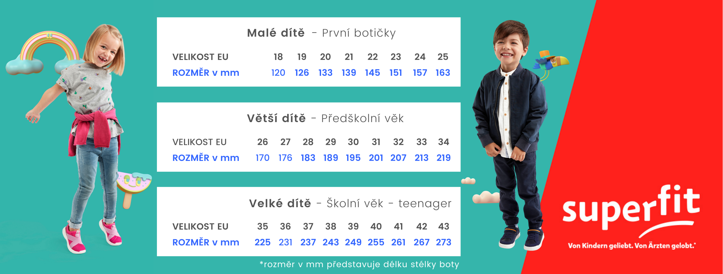Superfit přebírá zodpovědnost za dětská chodidla a jejich zdravý vývoj. Jsme číslem jedna v oblasti evropských dětských bot, těžíme přitom ze 70 let zkušeností ve vývoji a výrobě dětských bot všeho druhu. Náš úspěch vychází z toho, že naše boty jsou speciálně vyvinuté pro děti. Naše boty se prodávají ve více než 45 zemích. Proto také máme tak vysoké nároky na naši dětskou obuv.